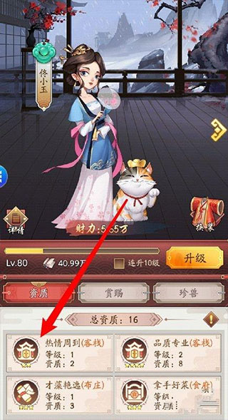 其实在第一天我已经说过了,我们要尽可能的培养一个门客,所有的资质书都给他用,阅历也分出一大半给他,对于主线任务我们基本可以不用理会,但是门客等级越高需要的阅历也是几何倍增长,所以我们可以适当分出去一些零头升级其他门客就可以了(具体分多少自己把握,看消耗阅历的多少和财力的提升),但是所有的资质卷轴一定要给一个主力,还有所有的书都给主力(珍兽百分比加成影响书籍财力)