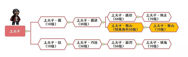在30级的时候,技、掘两条路线分别可以转职为【土夫子·巧技】、【土夫子·掘进】。其中,掘进的等级50级之后橙卡将能再转为【土夫子·?山】,擅长范围性挖掘以及攻击伤害,对于解决群怪还是比较讲究效率的。