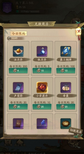 优先购买活力丹,体力丹,声望符。活力丹用于挚友徒弟培养,提升赚速,冲榜必备。体力丹用于游历,获得声望和资源。声望符用于提升声望。
