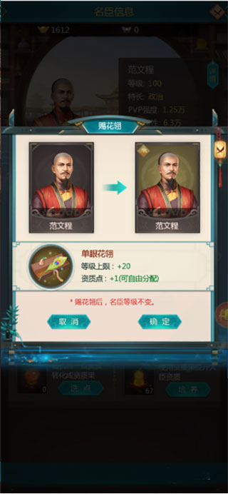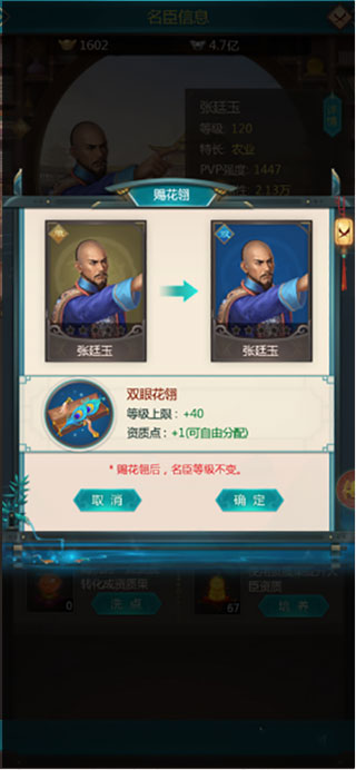 3、给大臣赐花后玩家的级数是不会归零的,还是保持原来的级数,需要玩家在继续升级,配点后玩家就拥有了可以洗点的点数,玩家在使用洗髓丹后可将大臣的一点资质转换成资质果来使用,所以玩家要多使用洗髓丹。