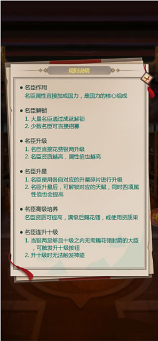 2、配点后,国力会大幅度的提升,当然大臣自身也会提高很多,但是玩家如果想让外郊的推图快点,更能容易的打下城池获取更多资源,那么小编建议大家多加军事,军事足够后再加其他。