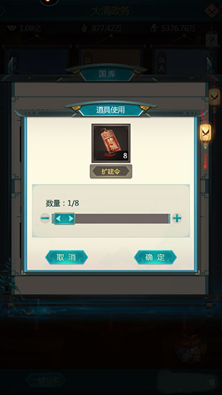 这里小编建议大家,在前期升级国库的时候,不要使用扩建令,使用元宝进行升级就可以了,前期需要的元宝比较少,当双库的等级达到10级之后,再使用扩建令,这样收益是最大的,可以尽可能的提高国库的等级。