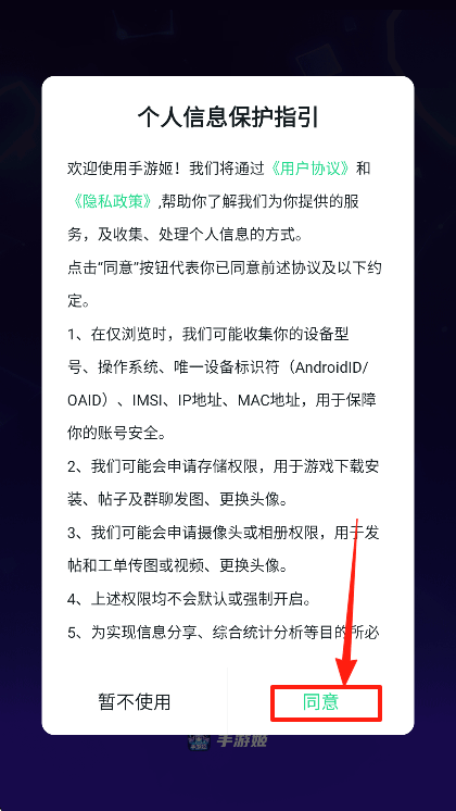 1、打开手游姬官方版软件同意相关的隐私协议规定;