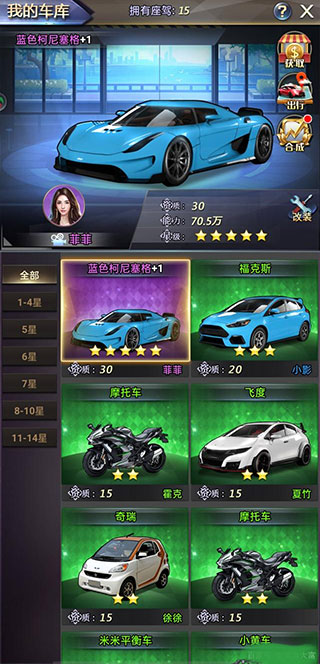 再来说一说座驾的玩法,座驾的获取很简单,总是在不经意间就能拿到绿色的,这也是品质最差的,品质最高的座驾是6星,目前还没人能拿到,需要大量氪金才行,坐骑可以改装,也可以合成,点击合成界面会看到相应的条件,2个2星合成一个3星,以此类推,坐骑是最能提升人才能力的方式,因此这才是最主要的玩法