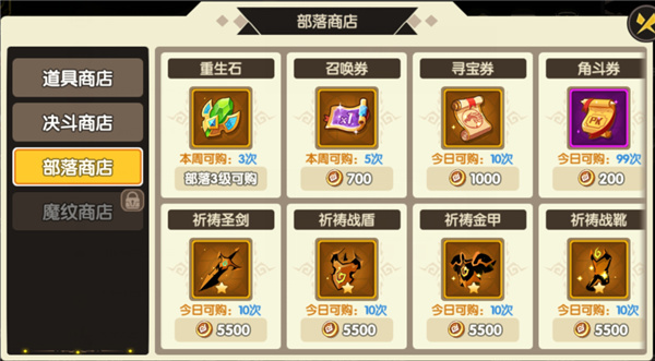 橙色1星装备、重生石、召唤券等稀有强力道具,都能在部落商店买到。