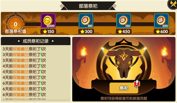 祭祀,是提升部落最重要的步骤。奉献钻石为部落祭祀,不仅获得一定数量部落币,祭祀值达标还能领取相应的金币、部落币奖励。