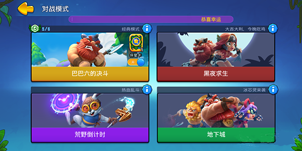 对战模式共有八八六的决斗、黑夜求生、地下城以及荒野倒计时四种玩法,参与所有玩法都需要消耗20点体力。玩家每天在对战模式获得的前六次胜利都可以开启宝箱,可获得金币、碎片等资源。