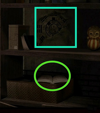 9、移步到右侧书架,第二层有个阴阳镇,按照灯笼上的提示打开,取到照片