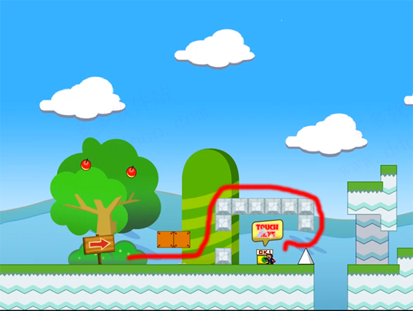 到其后赶快逃,然后来到一个由4个砖块构成的所谓的“炮台”,通过在“炮台”上跳跃来攻击它,攻击的时机就是它张嘴攻击玩家的时候,一边躲避它的火球,一边攻击它的嘴。它一共会移动3次,它会变成一些奇怪的东西,躲避即可,3次之后,又要开始大逃亡了,赶快,在左下角那个砖块上准备逃,待它撞上墙后即通过。