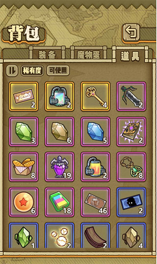 游戏中,白色边框的道具和装备为普通,绿色边框的道具为精致,蓝色边框的道具为极品。紫色边框的道具属性为史诗,橙色道具为传说,二者的获取难度相对前三种难度要高一些。