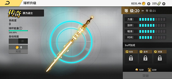 4、球杆维修说明:玩家每次出杆会减少球杆能量1点,球杆能量为0的时候,必须维修,否则球杆属性会减少为球杆初始属性的50%