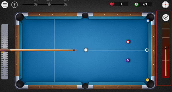 瞄准器的衍生线的长度和击球的角度有关,瞄准器的圆形代表的就是母球,圆形与目标球的交界点就是击打位置,圆形内部的衍生线代表的是母球的前进方向。