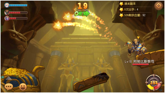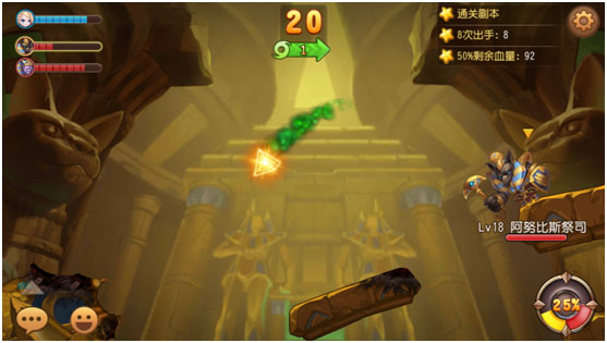 分析该地图,通关并不困难,左边精英怪的血量相比右边boss要少一些,那么优先打精英怪也是一种可以减少伤害的方式,在自己的有效攻击分配合理的情况下,8次出手解决战斗也不是什么难事,关键在于,两个怪物的攻击力都较高,在2V1的情况下,8个回合意味着血量过半是件比较难以完成的事情。