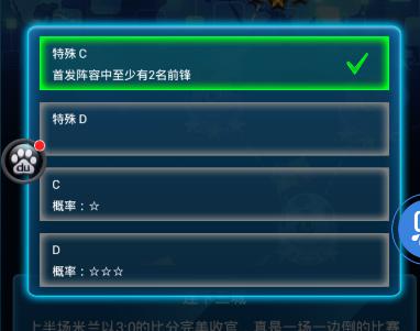 B-C/D,图为B前进至C或D的要求,这里可以看到,特殊要求-C。首发阵容至少两名前锋,也就是说。除了361,451A,451B,541A,541B,其他的阵型都符合前往C的要求!特殊要求-D无,也就是说没有特殊方法可以前往D,而最后两个C,D下方显示有概率一星和三星,一星的概率相当于25%。