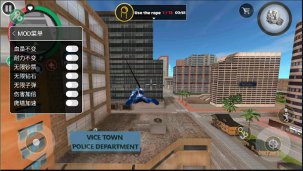 2、使用绳索在城市中穿越,控制你的英雄成为大都市惩奸除恶的大英雄;