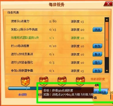 在每日任务中,活跃度达到50时,玩家可领取大量训练点奖励,想要获得这份奖励,就赶紧提升实力,承担起一轮又一轮的任务吧!