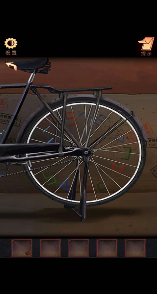 9、来到室外,点击电线杆后的自行车,通过转动车轮可以得到密码提示,红9蓝4绿3,根据这个提示打开墙上的邮箱,点击获得【磁铁】。