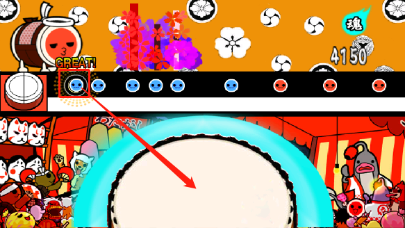 当音符与小圆圈重叠时,敲打鼓面直至超过指定次数。每敲打一次,就会加300分(燃烧段360分),敲打完(气球爆掉)会有固定5000(燃烧段6000)加分,未敲完则无固定加分。