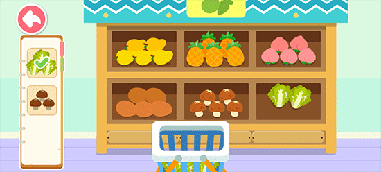 根据颜色和外形特征来辨认商品,锻炼宝宝的识别能力。香蕉是黄色的水果,西红柿是圆滚滚的蔬菜。桃子是哪个呢?点点对应的商品,语音提示帮助宝宝了解商品的名称。