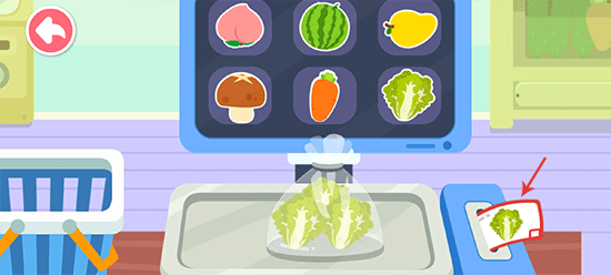 4、最后选择相同的水果,进行称重,称好之后将打出的标签贴在购物袋上,最后放进左侧的购物篮,就OK啦,当然游戏还没结束,玩家可以选择不同的物品继续进行游戏。