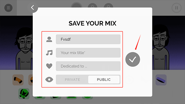 5、例如录制,将节奏混音录制完后将混音名字、标题、权限设置好后点击右边的√