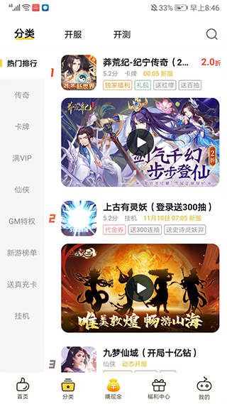 3、进入【分类】界面,包括传奇、卡牌、满VIP、仙侠、GM特权、开服、开测等丰富的游戏分类,玩家可以自行选择搜索感兴趣的游戏,我们以【上古有灵妖】为例,