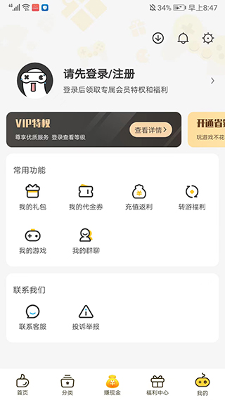 7、进入【我的】界面,包括一些常用的功能,比如我的礼包、我的代金券、充值返利、转游福利、我的游戏、我的群聊、联系客服等等,以上就是0氪手游平台app的使用方法了。