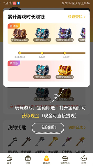 5、进入【赚现金】界面,我们可以通过玩游戏累计时长来获取宝箱,打开宝箱后可以获得现金奖励,