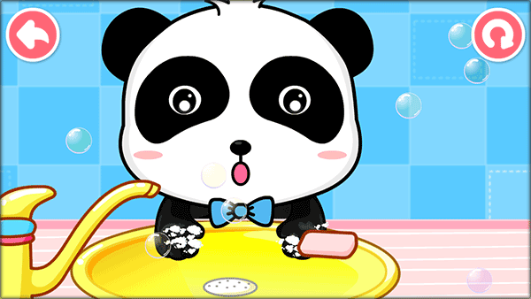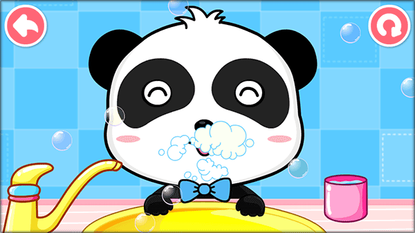 洗澡:动物伙伴来洗澡咯,左扭扭,右扭扭,肥皂泡泡不见了。洗澡澡,消灭细菌小怪。