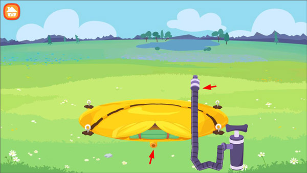 3、根据手势提示打开帐篷零件,将螺丝固定再帐篷四周,利用充气工具使帐篷立起来;