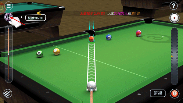 和电脑AI对战,有标准的8球和9球规则,触摸屏幕来调整方向,拖拽右边的力度条,松开击球。