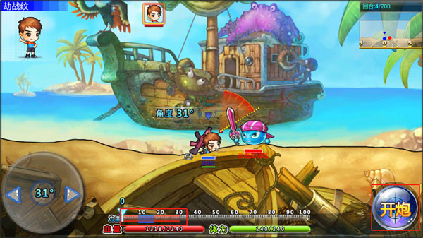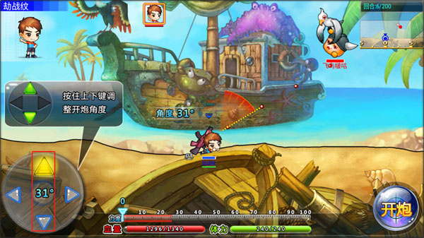 8、在按住游戏右下角的开炮,等游戏下方的力度到达蓝色区域即可开炮;