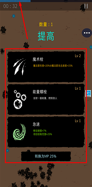 3、在游戏中角色会自动进行攻击,玩家们只需要移动躲避袭来的怪物,并拾取随机掉落的经验点升级即可;