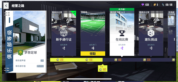 3、在“经营之路”页面中,你可以查看到俱乐部名称、俱乐部等级、俱乐部声誉以及俱乐部价值这些基本信息。页面右侧的声誉进度条对应了游戏功能的解锁进度。如上图所展示的,当俱乐部声誉达到180时,“在线比赛”功能就将解锁了。这个时候可能又有玩家会问了:“声誉该如何获取呢?”