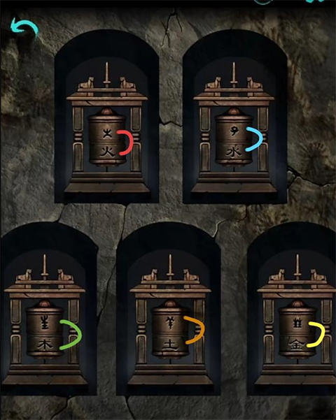 根据墙上画的5个字带有金木水火土→解开右上边的谜题(后面有用)→进入