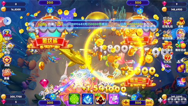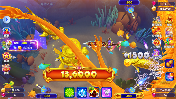 此外,猎鱼达人千炮捕鱼手游还推出了多人竞技赛和王者之战等多种竞技玩法,玩家可以与其他玩家进行实时在线竞技,赢取奖励和荣誉,体验百里挑一的霸主荣光。在游戏界面方面,猎鱼达人手游采用了全新的画面风格,让玩家能够更加真实地感受到海底世界的神秘和美丽。