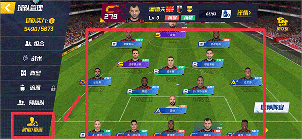 4、接着在球队管理界面中将需要重置的球员选中,并点击左下角解雇/重置。或者直接将他拖动至左下角重置按钮上