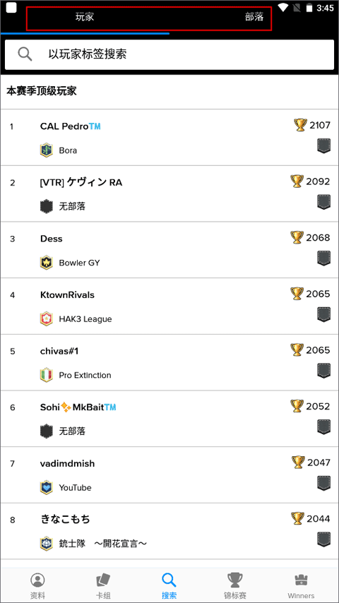 搜索包含玩家和部落两个部分,都是通过标签来找到相对应的成就、等级等信息。