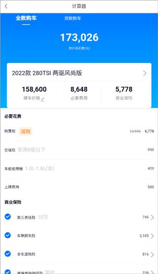 2、进入界面后,选贷款还是全款购车,再选择你的车型、裸车价格等信息,即可即可计算出大概的价格。