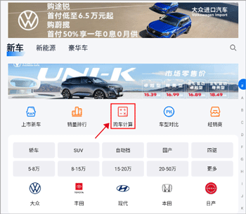 1、打开软件后,在首页点击“购车计算”
