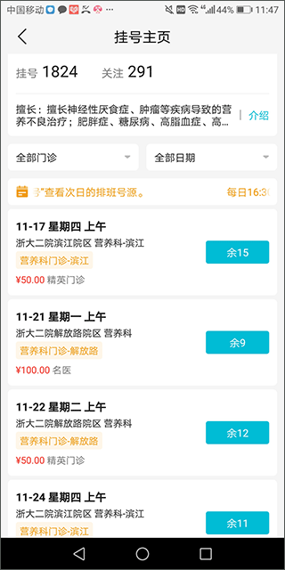 提前预约1-7天号源,每天14:00点市级医院开放号源,15:00点省级医院开放号源