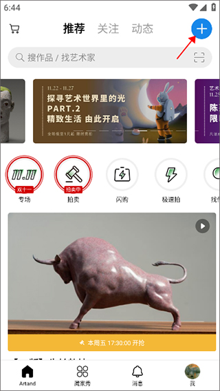 1、首先在手机上打开并登入Artand,进入主页后点击右上角的蓝色加号按钮进入作品发布环节