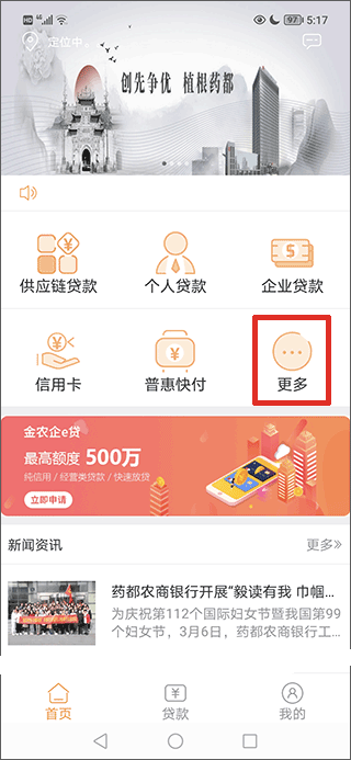 1、打开药都农商行手机银行app,在首页找到并点击“更多”按键;