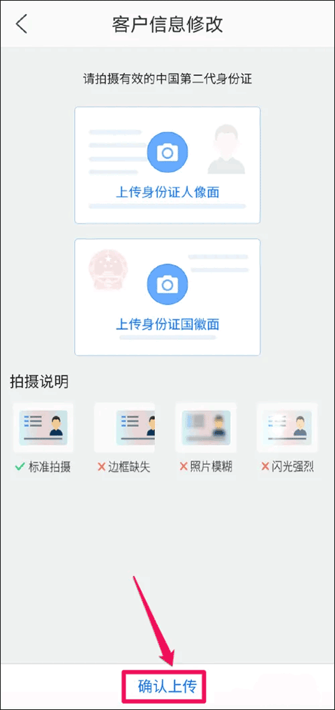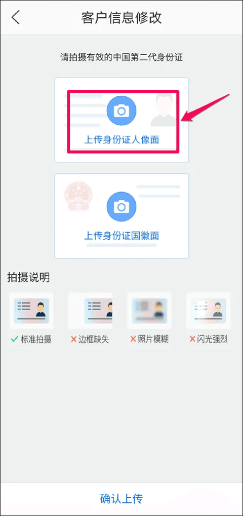3、然后,在客户信息修改界面找到并点击“上传身份证人像面”选项,进行拍照或调取手机中的身份证信息;