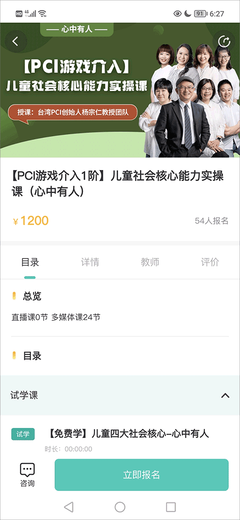 3、接着,在看清楚目录、详情、教师和评价后就可以点击立即报名或者咨询了。