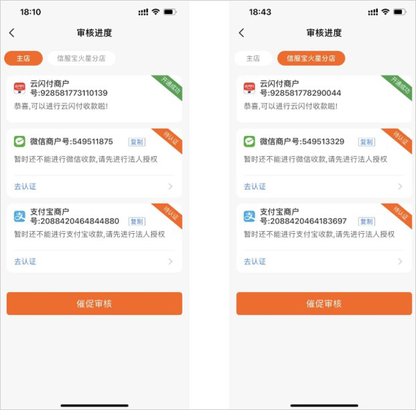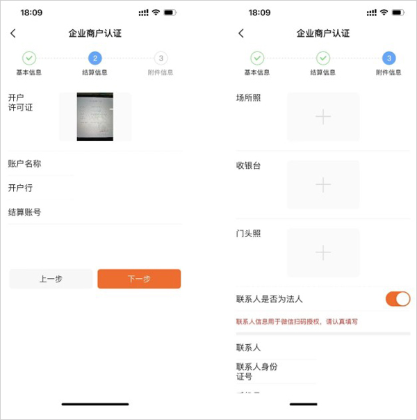 Tips:营业场所照片不能与总店一致,否则会导致入网失败;如分店微信、支付宝实名认证为非法人,可选择输入认证联系信息,指定联系人认证。