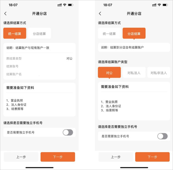 Tips:分店结算方式有统一结算和分店结算。总店结算方式为对公结算时,才能选择统一结算;分店结算可结算到分店对公、对私法人和对私非法人账户。