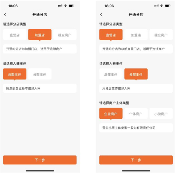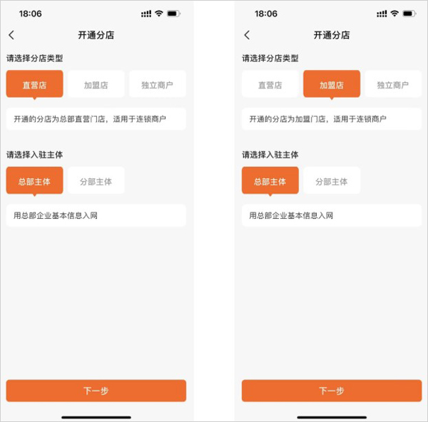 Tips:分店类型有三种,选择独立商户时,入网主体为独立主体,与现有商户没有关联,选择其他分店类型时,可选择用总部主体企业信息入网或者分店自身主体企业信息入网。