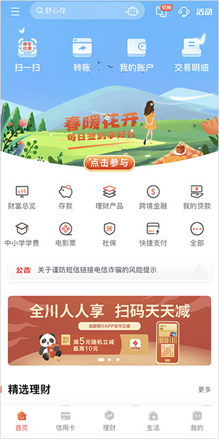 成都银行app是由成都银行股份有限公司为广大用户设计的一款手机银行服务软件,为用户提供了账户查询、转账汇款、信用卡、理财、缴费等多项功能,让客户随时随地尊享7×24小时的贴身金融服务,轻松掌握账户资金动态,有效进行财富管理。同时秉承业界最高安全标准,采用数据全程加密、密码超限保护、登录超时控制、安全退出等机制,并通过短信验证码、交易密码、预留信息、设置转账/支付限额等多重措施,全方位保障您客户端手机银行的私密化,使您的使用过程更安全更高效。除此之外,成都银行手机银行app还拥有生活服务功能,能够支持电话卡、水费和电费等各项缴费,用户可以通过该软件进行各种生活缴费,同时还能查看账单详细情况,让用户账单不用愁,生活更轻松,使用更放心,那么有需要的用户千万不要错过,快来下载体验吧。