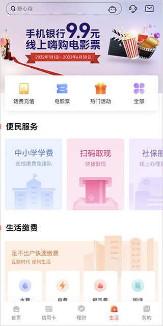 4、在生活模块中,用户还可以进行话费充值、中小学学费缴纳、购买电影票、缴纳水电费等等操作。